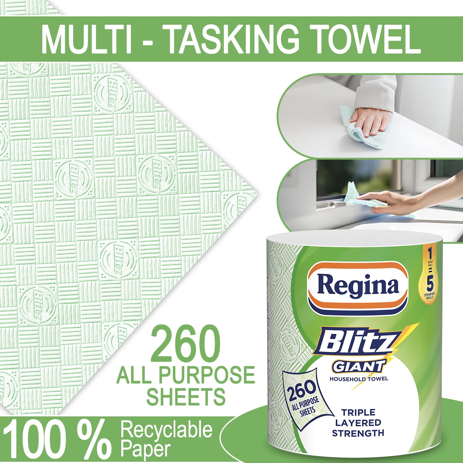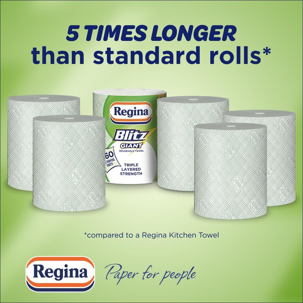With the use of technology and a clear defined strategy, Sofidel aims to reduce its environmental footprint to:– Cut CO₂ emissions– Respect forestry resources– Limit water consumptionDon’t just clean it, Blitz it… with Blitz Giant! Regina Blitz Giant multi-purpose household towel is perfect for any jobs – from tough tasks to anything else in between. With 260 Blitz-engraved compact sheets, each GIANT roll equals 5 standard kitchen rolls *, and its 3-ply strength lets you mop, shine, clean & dust with ease. Made from pure cellulose and packaged in recyclable paper, it cares about quality and the planet.*Compared to a Regina kitchen towel with 50 sheets per roll